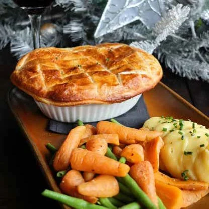 A classic Sunday roast with all the trimmings - roast beef, mashed and roast potatoes, seasonal vegetables, Yorkshire pudding, rich gravy, and a side of mac ‘n cheese.